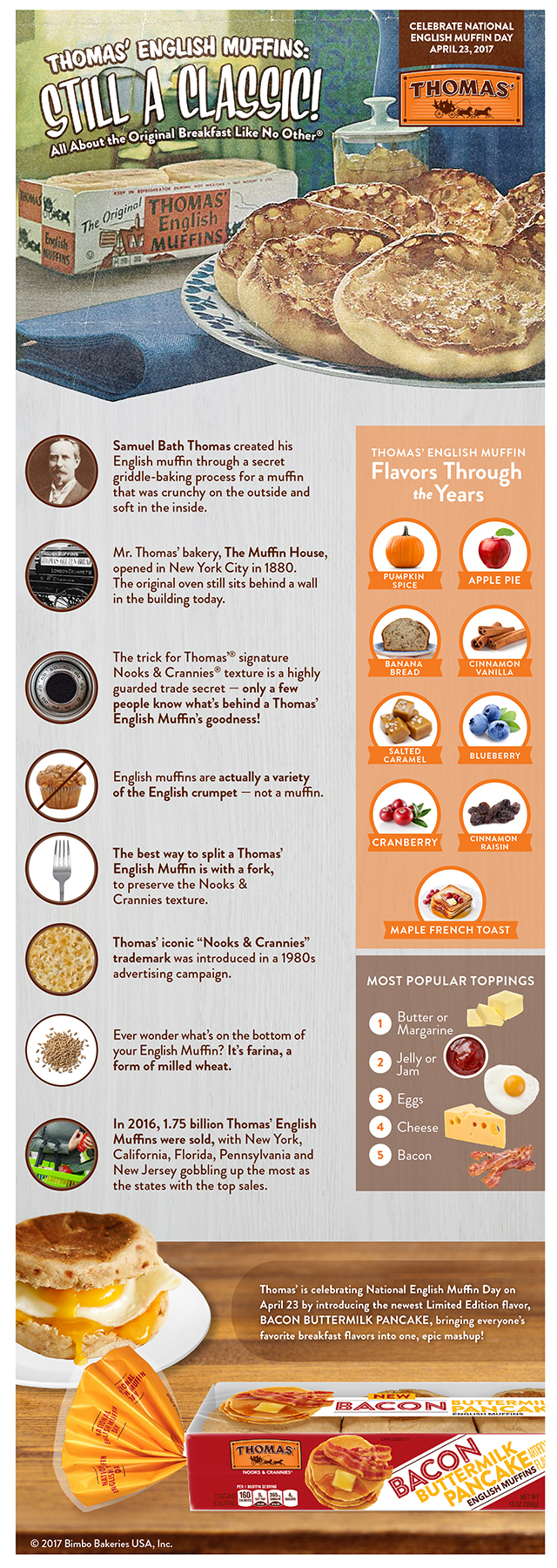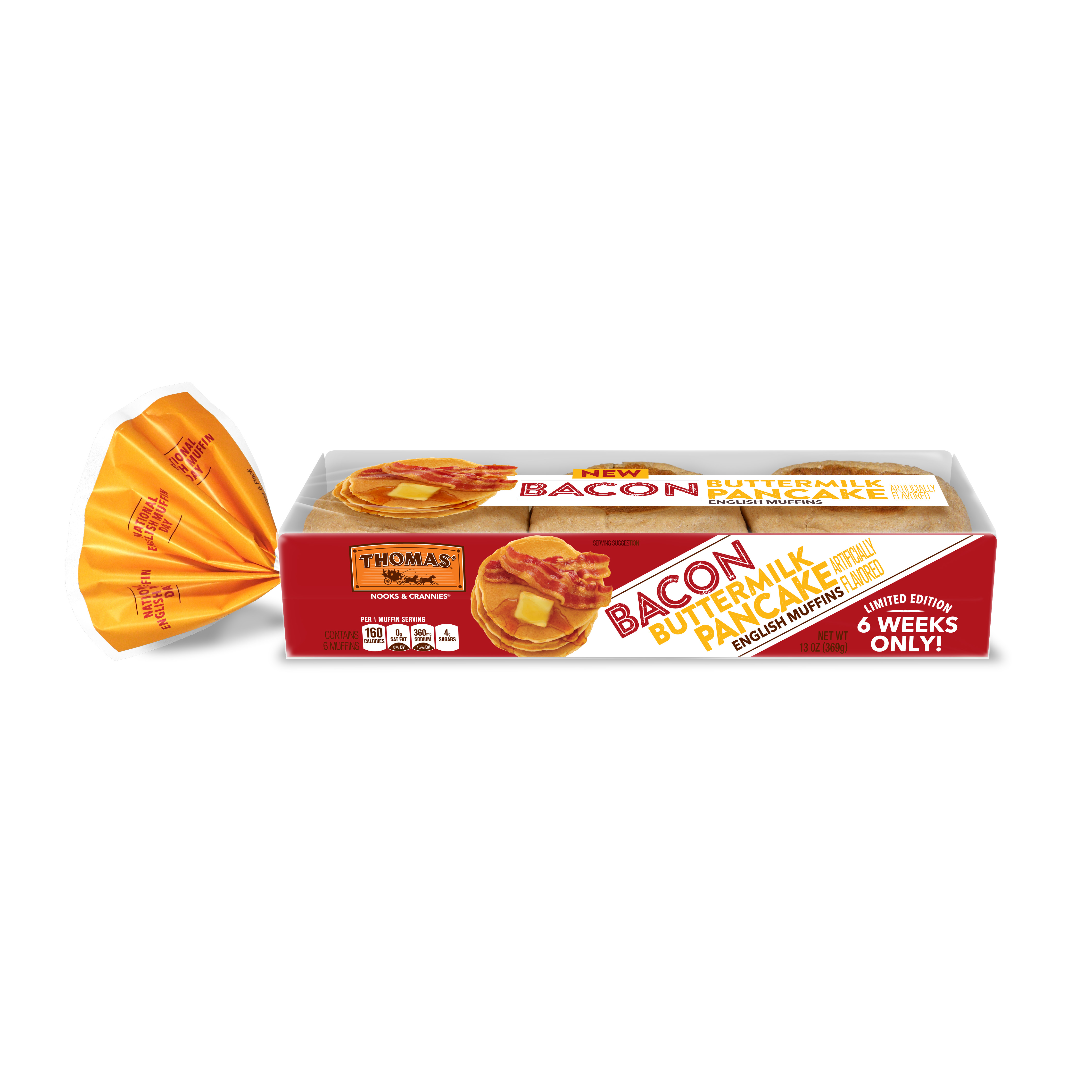 To give fans even more reason to celebrate one of their favorite breakfast items, Thomas' will also be releasing a new, limited edition English Muffin flavor in honor of National English Muffin Day: Bacon Buttermilk Pancake!